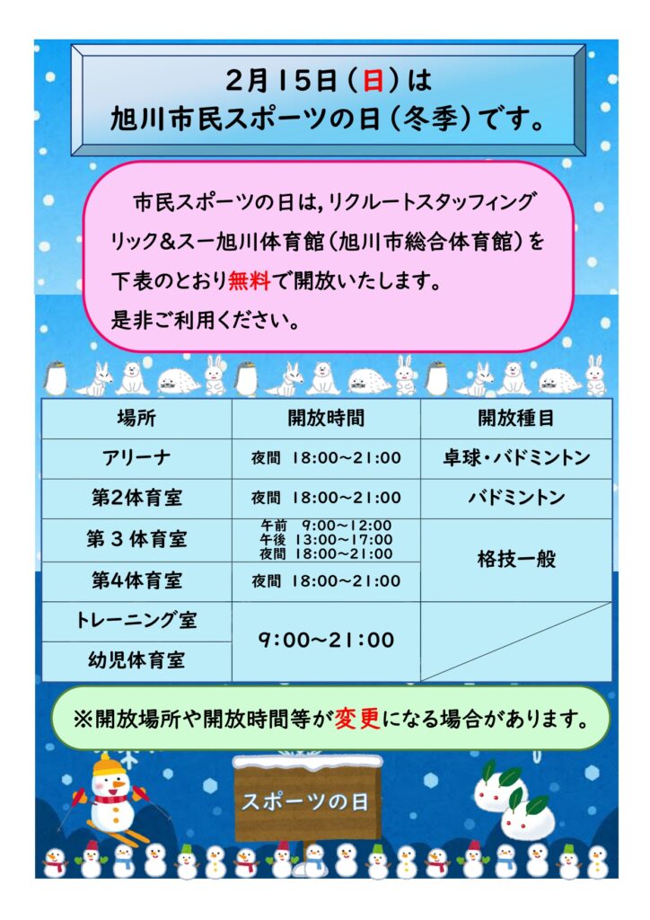 旭川市民スポーツの日(2月15日(日))に総合体育館を無料開放します。