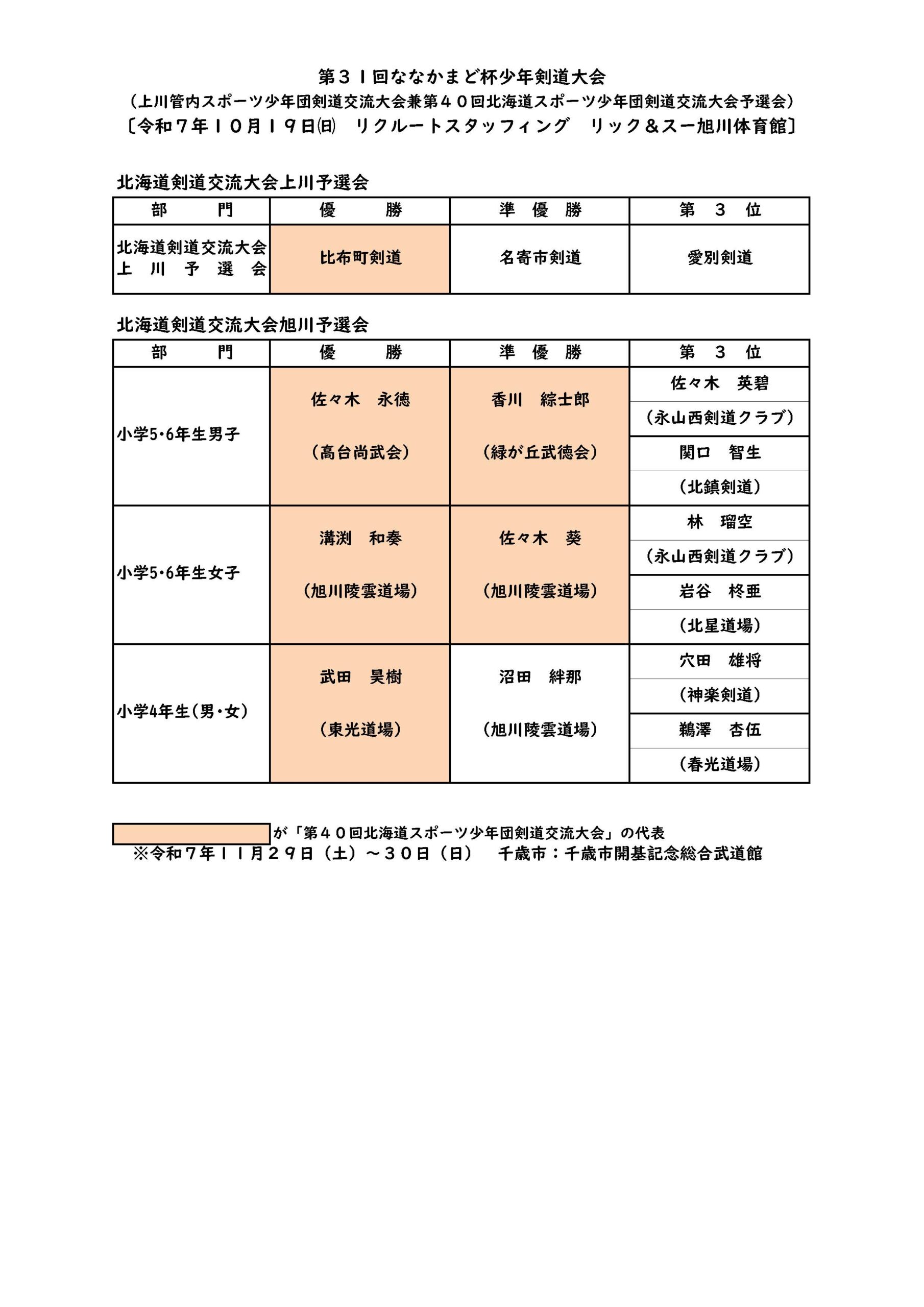 同予選会<個人戦>小学5・6年生男女の部で優勝・準優勝した4名と小学4年の部で優勝した1名は旭川選抜として、令和7年10月19日(日)に千歳市で開催される、『第40回北海道スポーツ少年団剣道交流大会』に出場いたします。