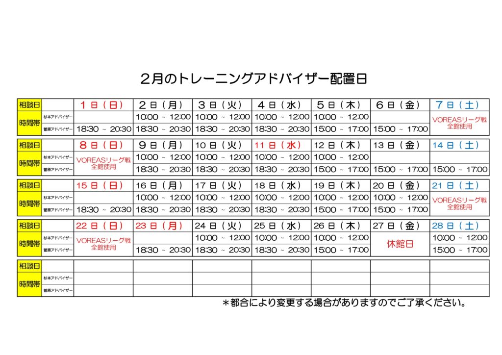 2月トレーニングアドバイザー配置日のお知らせ